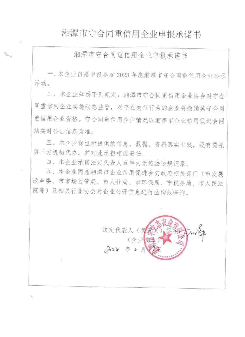 本企業(yè)根據(jù)《湘潭市守合同重信用企業(yè)申報規(guī)定》等編制 2023 年度企業(yè)信用報告書,并保證本報告書內(nèi)容真實、準(zhǔn)確、完整。